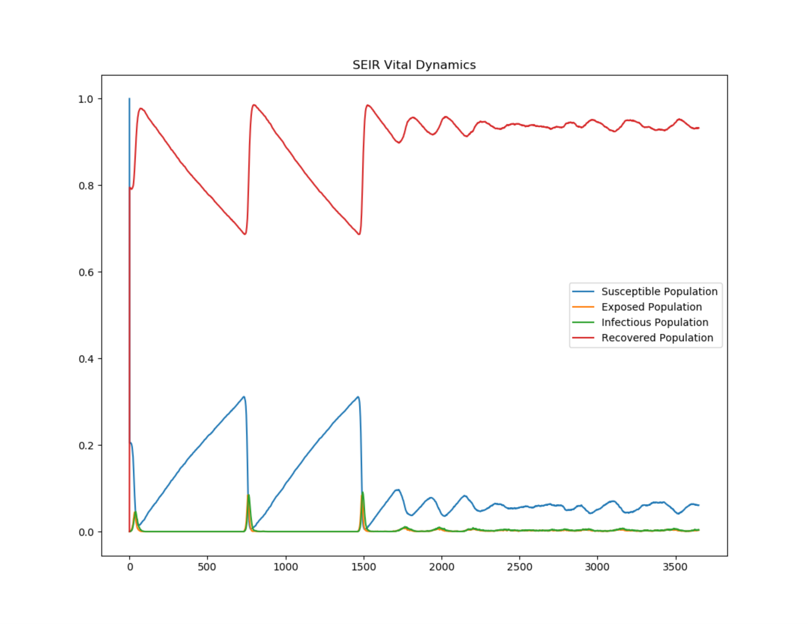 Figure 5: SEIR periodic outbreaks on reintroduction in a population with vital dynamics#