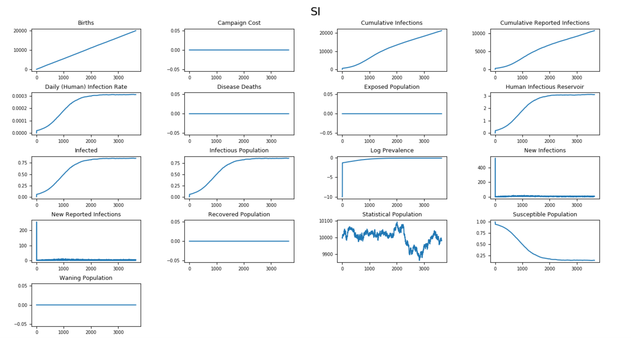 Figure 4: All output channels for an SI outbreak with vital dynamics#