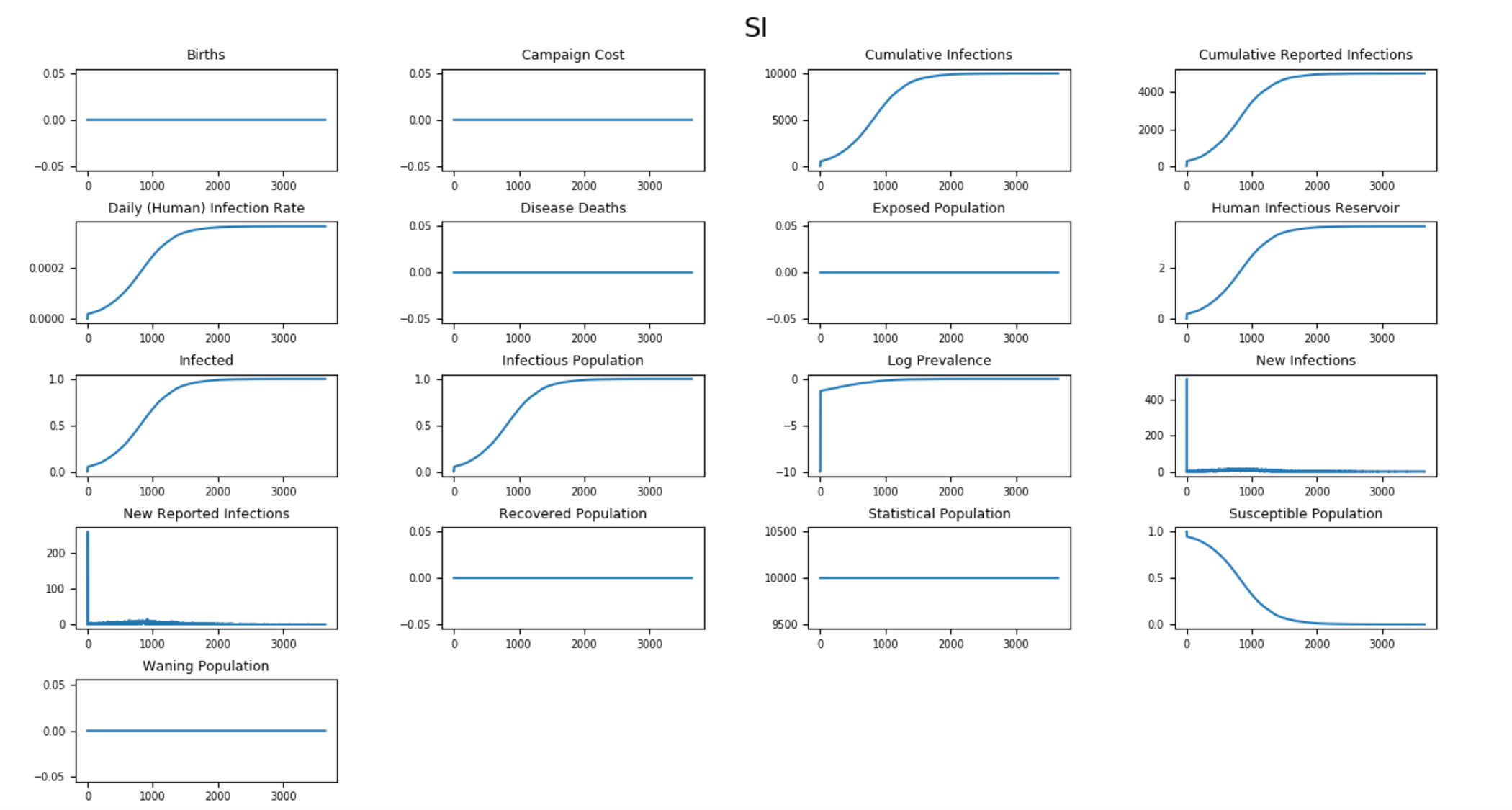 The dynamics of I in a SI model are also known as logistic growth. If there are no vital processes (birth and death), every susceptible will eventually become infected. The EMOD generic simulation uses an SEIR model by default. However, it can be modified to an SI model by turning off incubation and setting the infectious period to be longer than a human lifespan.