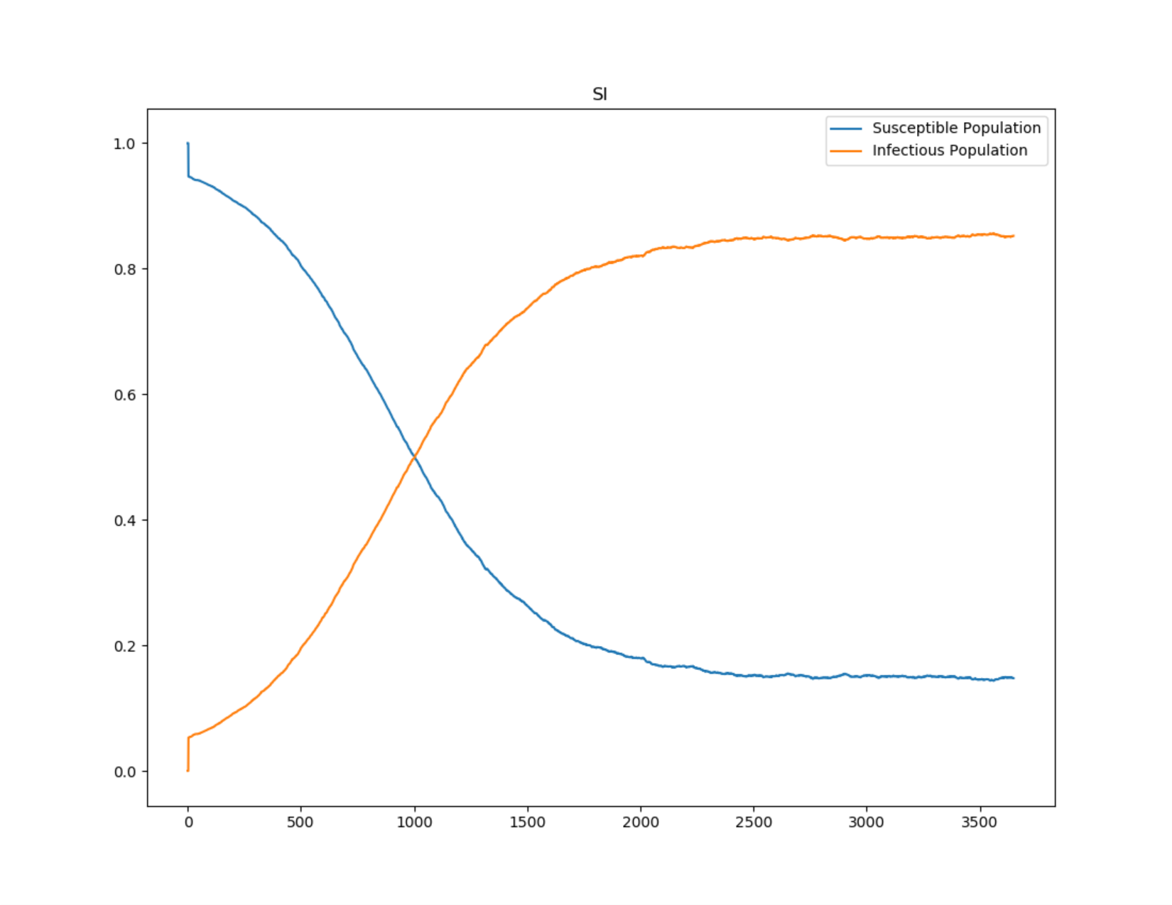 Figure 3: SI outbreak approaching 85% infected population at steady state#