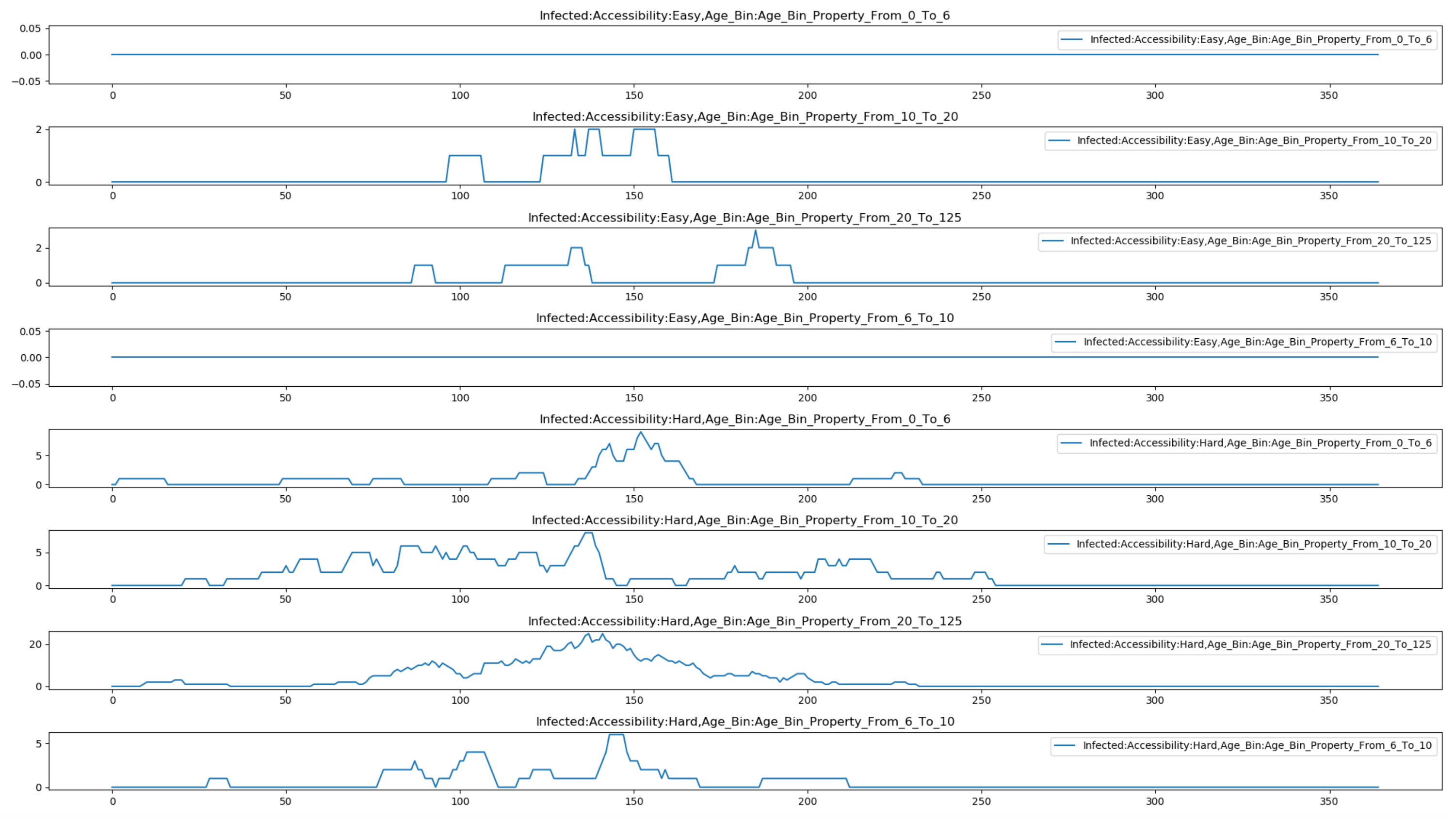 The following graphs show the property reports for a HINT simulation with both age and accessibility properties in which transmission is lower for hard-to-access individuals and there are an equal number of “easy” and “hard” to access individuals. The first graph shows the effect of targeting vaccination to children aged 6 to 10. The second graph shows the effect of instead targeting it to all individuals who are easy to access.