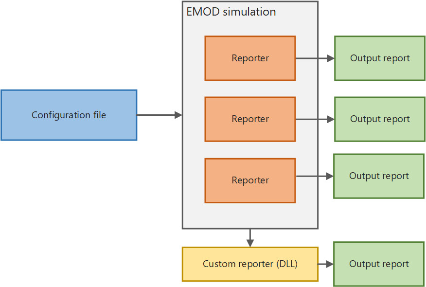 The EMOD functionality that produces an output report is known as a reporter. EMOD provides several built-in reporters for outputting data from simulations. By default, EMOD will always generate the report InsetChart.json, which contains the simulation-wide average disease prevalence by time step. If none of the provided reports generates the output report that you require, you can create a custom reporter.