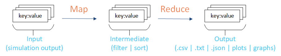 An example of this process with idmtools is to use the simulation output data as the input data (key:value pairs), filter and sort a subset of the data to focus on, and then combine and reduce the data to create the final output data.